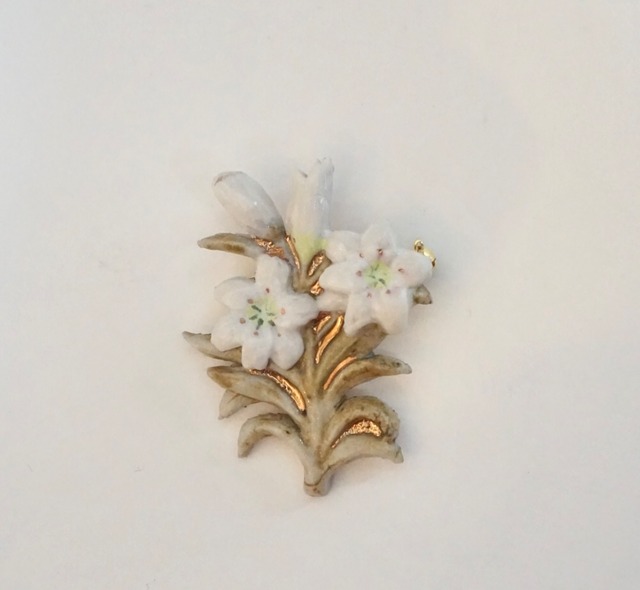 北原裕子さんの作品です 陶製のビアトリア朝のようなハンドモチーフに 無垢な百合の百合の花束が美しいブローチです。 ゴールドの葉 3 × 6 × 1.5 cm 陶器 金具ピン