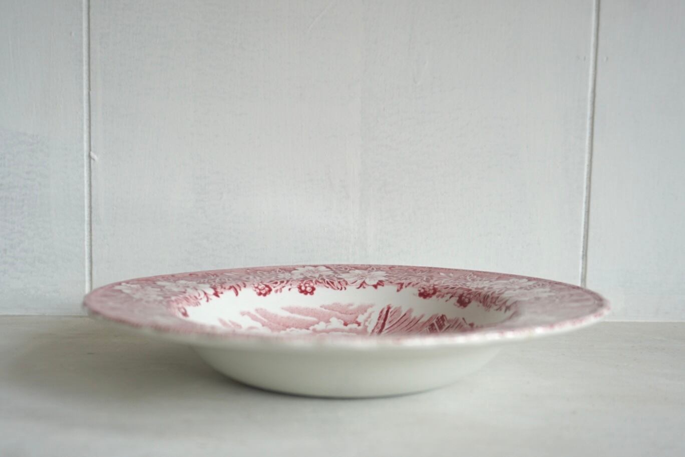 落ち着いた赤とピンクが混ざった様な温かみのある色合いと優雅なデザインが特徴の深皿です。